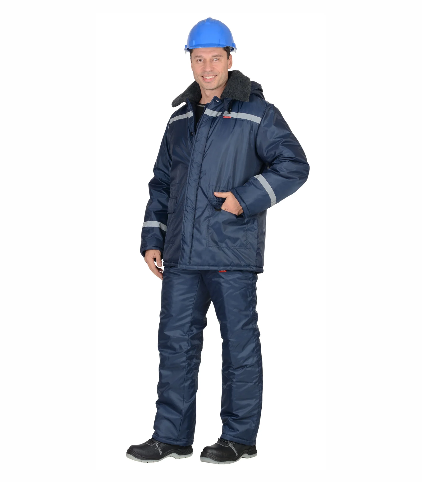 Куртка длинная прямого силуэта с притачной утеплённой подкладкой; с отложным воротником из искусственного меха; с центральной потайной застёжкой на 4 петли и пуговицы (верхняя петля сквозная) и внутренним ветрозащитным клапаном; нижними накладными карманами с клапанами на «липучках». По талии кулиса. В куртке предусмотрена лента светоотражающая 50мм для обозначения сигнальной видимости.